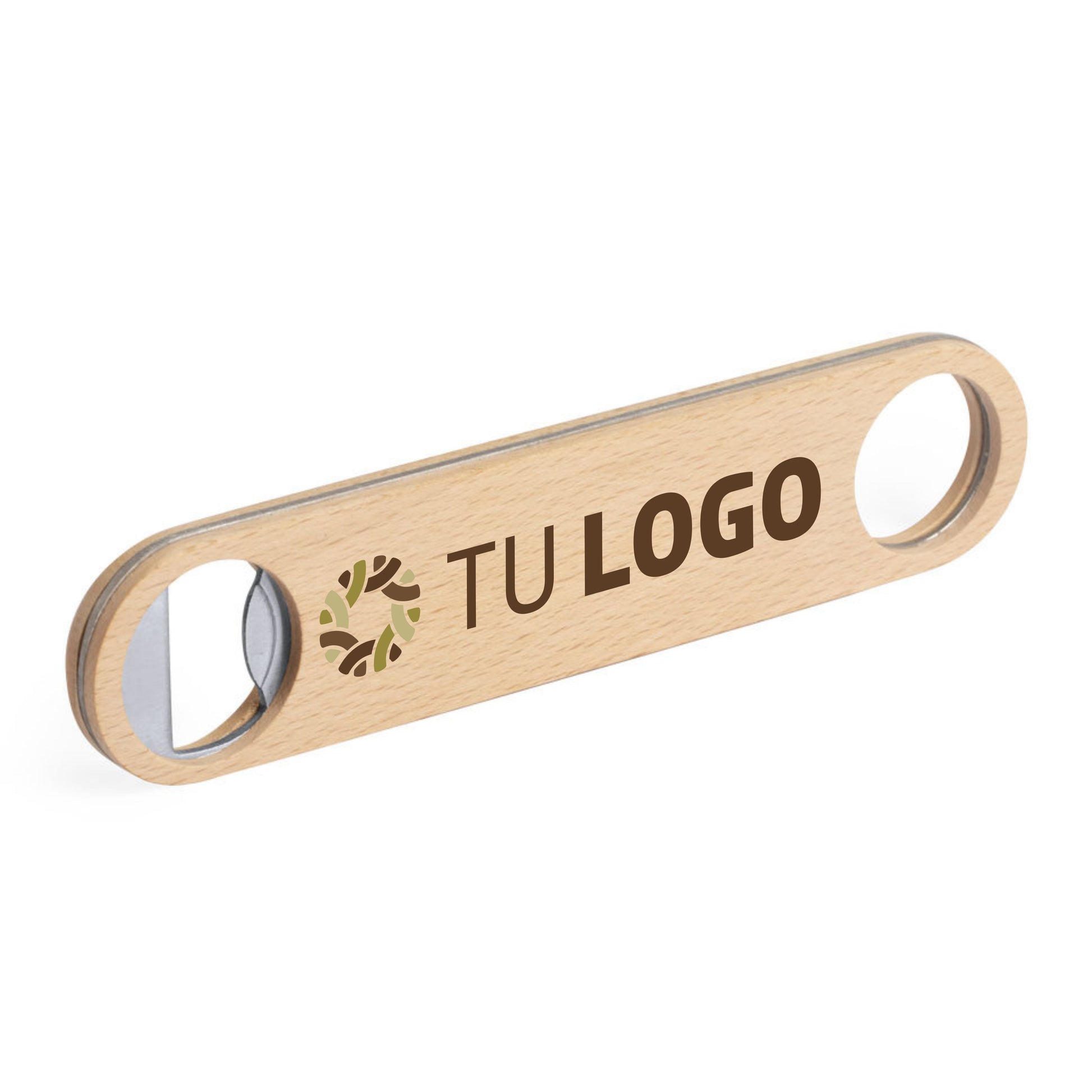 Abridor de madera de haya pulida con interior en acero inoxidable, con troquelado para colgar.