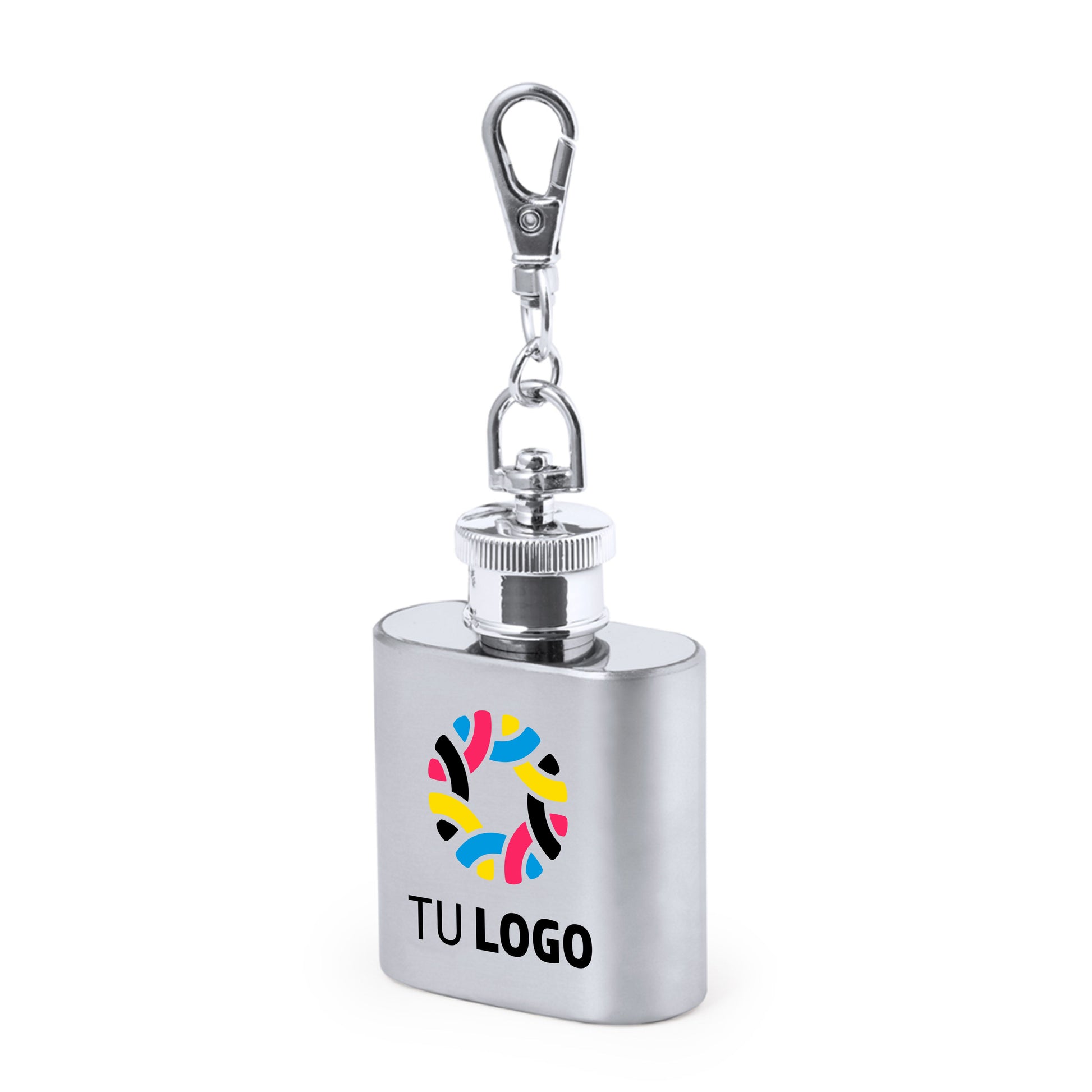Llavero petaca fabricado en acero inoxidable, de 30 ml de capacidad. Tapón con cierre de seguridad a rosca y mosquetón giratorio. Presentado en caja de diseño kraft.