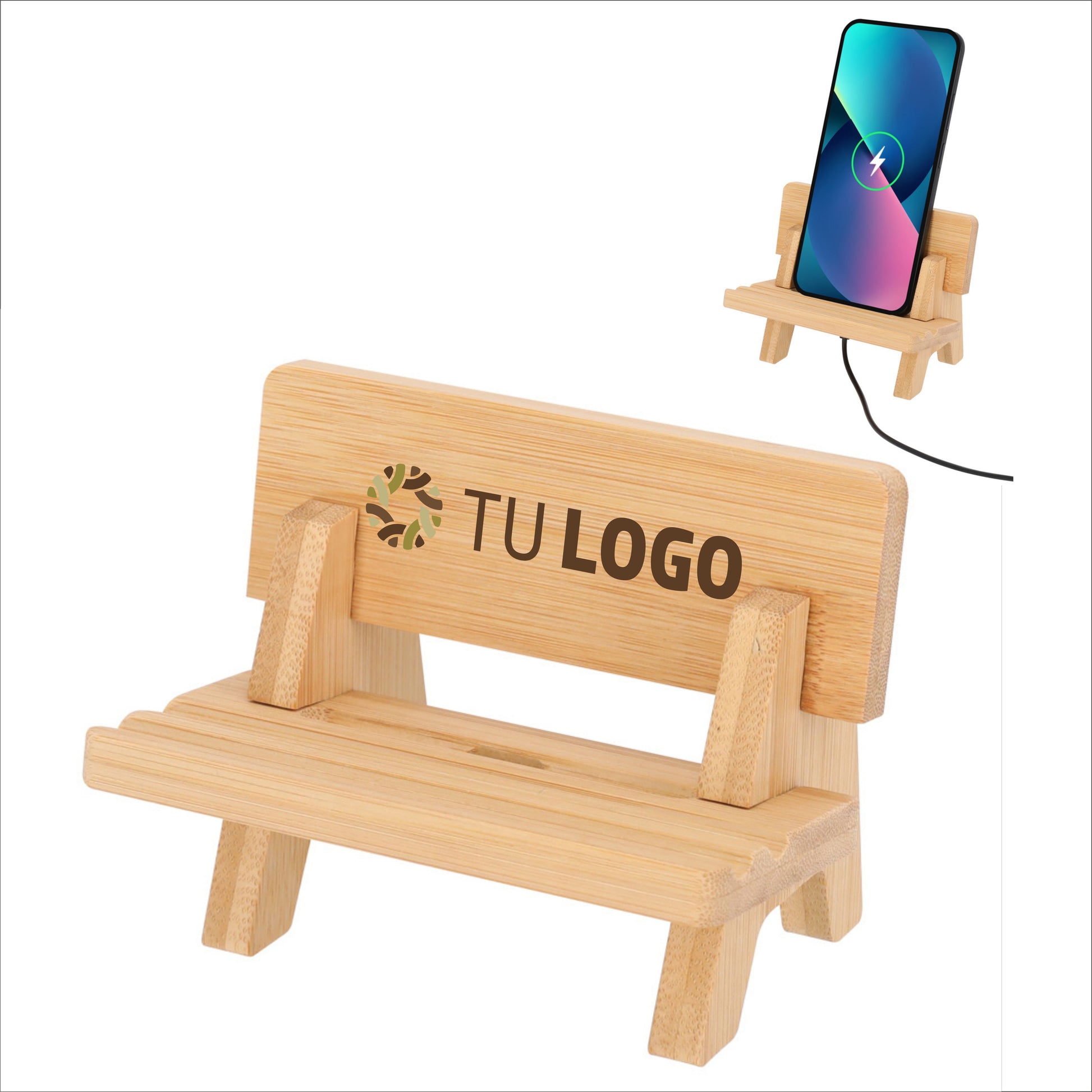 Soporte para dispositivo móvil en original forma de banco, fabricado en resistente Bambú. Con piezas desmontables que permiten 3 posiciones diferentes del dispositivo. Incluye ranura para el cable de carga, permitiendo cargar el dispositivos mientras está en el soporte.